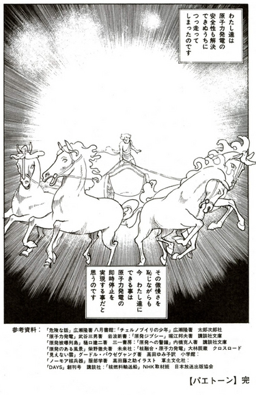 El libro, de 46 páginas en blanco y negro, se llama Phaethon. En la mitología griega, ese es el nombre de l arrogante hijo del dios del sol -Helios- que perdió el control del carro del Sol y puso en peligro la Tierra. Zeus lo mató justo antes de que arrasara el planeta. El cuento es claramente antinuclear y presenta al hombre como un ser arrogante que cree de forma imprudente que puede controlar la energía atómica. También hace pedagogía sobre cuántas nucleares hay en Japón y dónde están situadas.