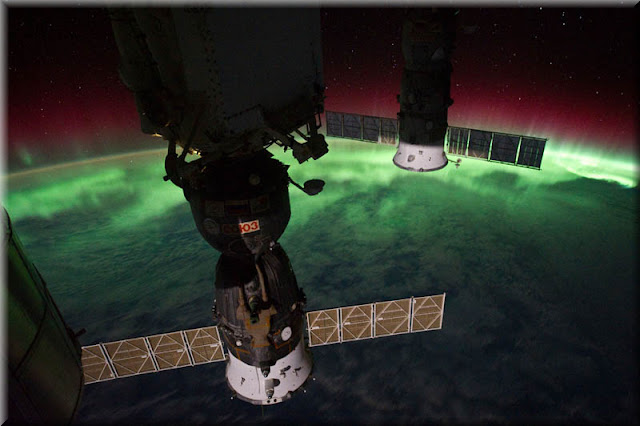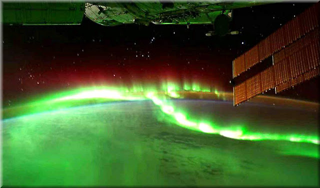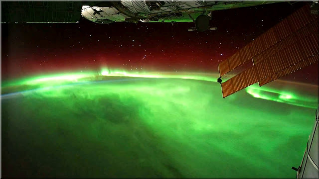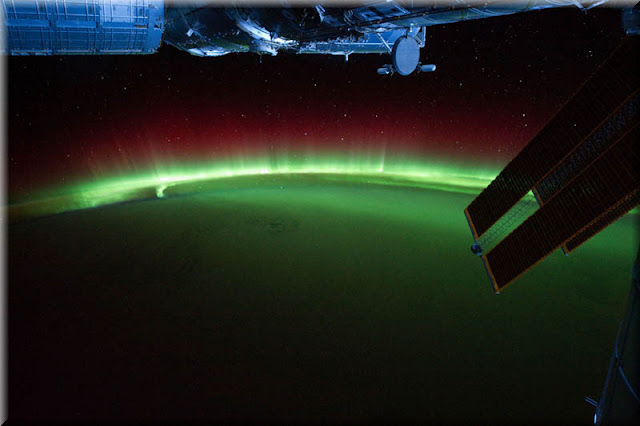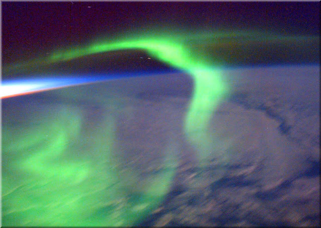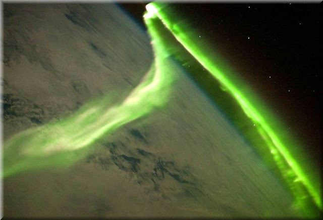Las partículas que llegan son guiadas por el campo magnético de la Tierra hacia un par de regiones con forma de rosquilla llamadas “óvalos aurorales”. Hay uno alrededor del Polo Norte y otro alrededor del Polo Sur. Algunas veces, cuando la actividad solar es alta, los óvalos se expanden y la estación espacial orbita justo a través de ellos.