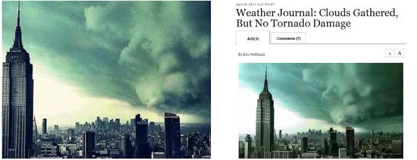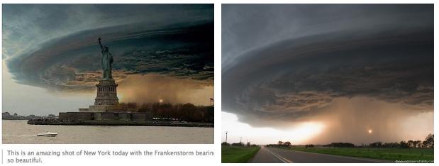 “Increíble foto del huracán #Sandy descendiendo sobre Nueva York”, escribió un usuario entusiasmado con el hallazgo, o con ganas de tener más seguidores. Pero se trataba de una imagen de 2011, como marca el ejemplo que vemos a la derecha.