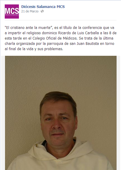 La primera charla la daba un oncólogo acerca de “El debate actual sobre la eutanasia”, la segunda un médico de paliativos acerca de “El encarnizamiento terapéutico, la sedación y el testamento vital”. La tercera la daba un Prior (Superior o prelado ordinario de un convento; en algunos obispados párroco o cura)  y teólogo con el siguiente título: “El cristiano ante la muerte”.